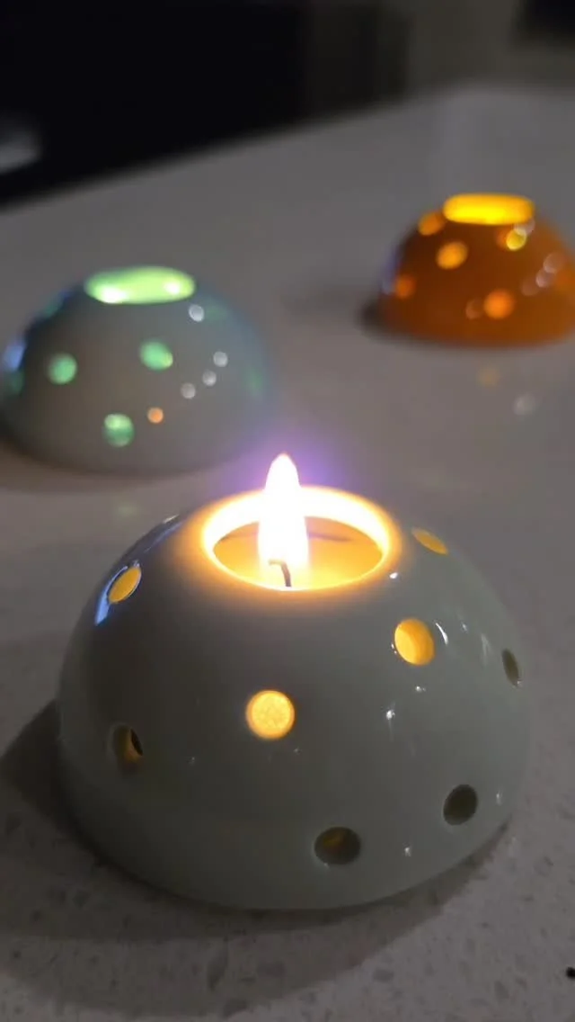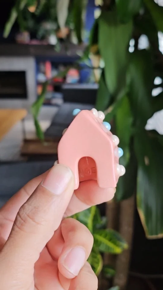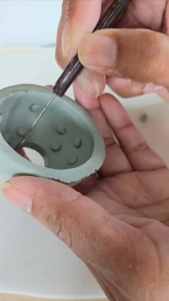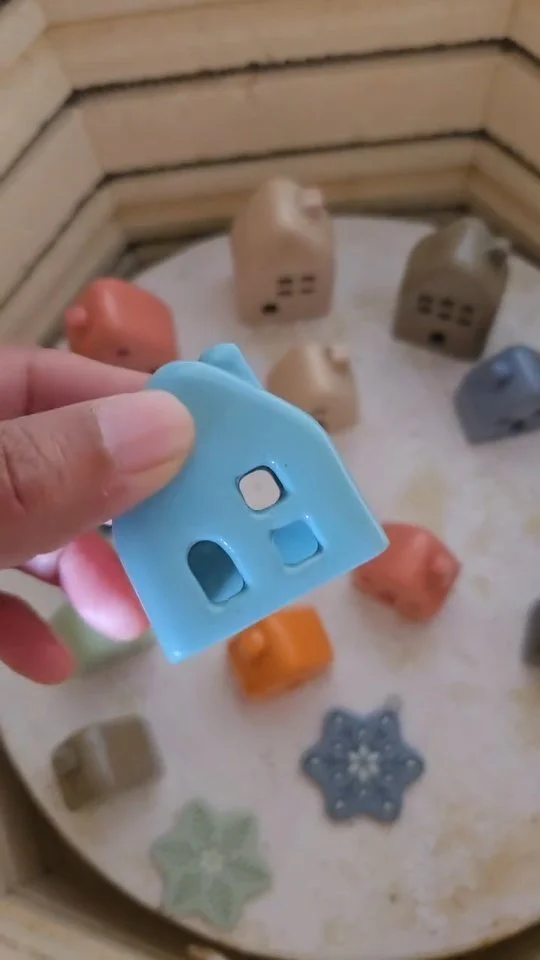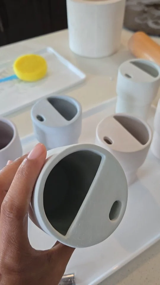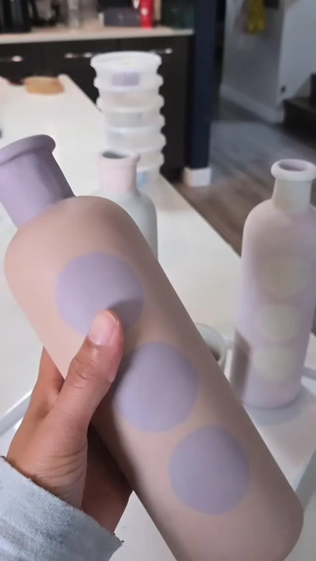 A pink jar with blue dots and a green jar with pink dots filled with pencil crayons on a table with a child's drawing and hands.