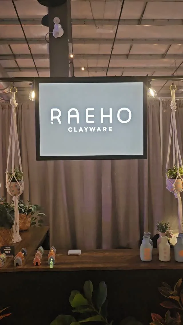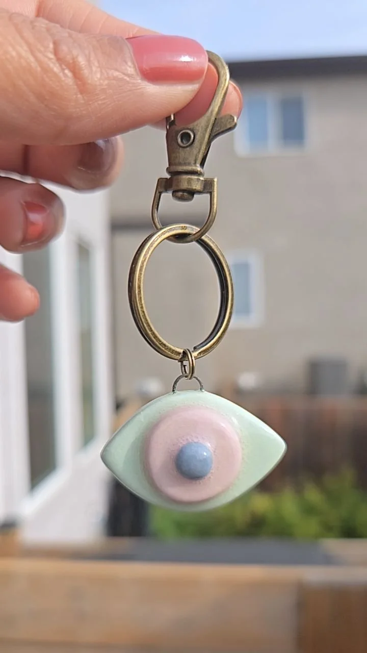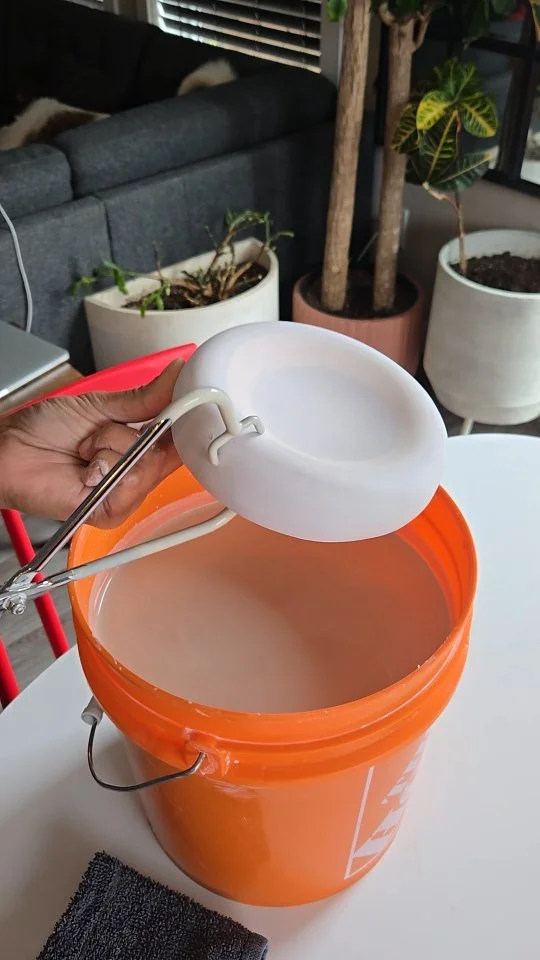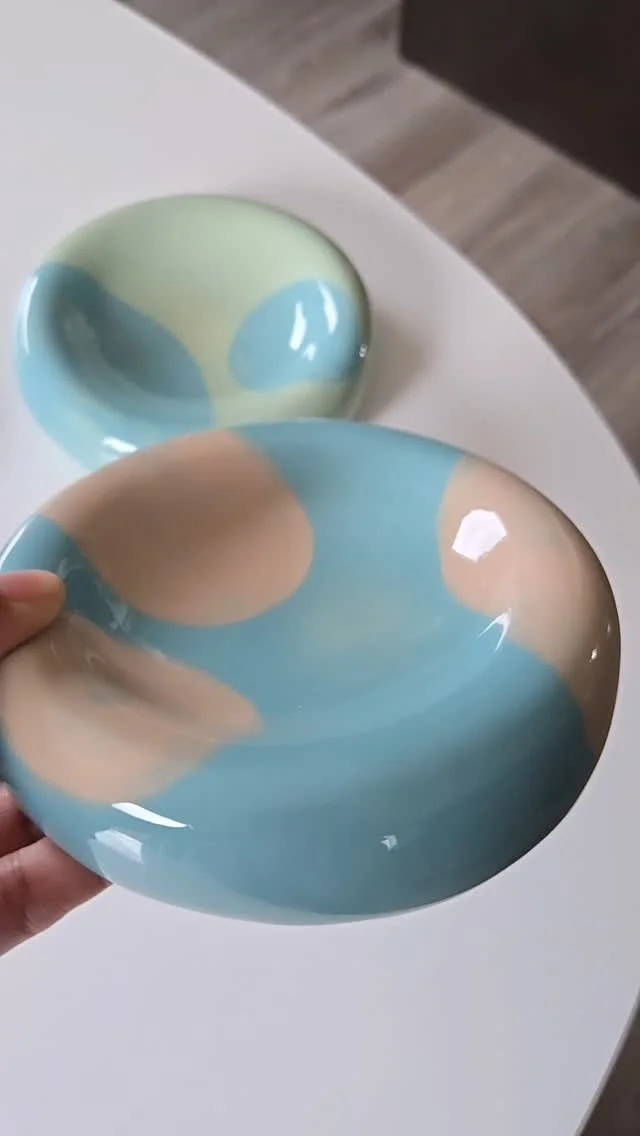 A pink jar with blue dots and a green jar with pink dots filled with pencil crayons on a table with a child's drawing and hands.