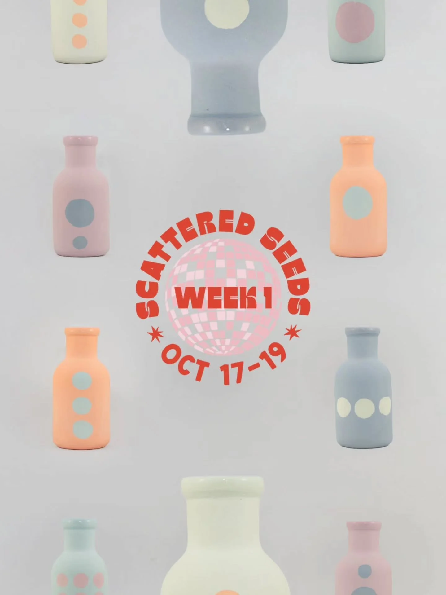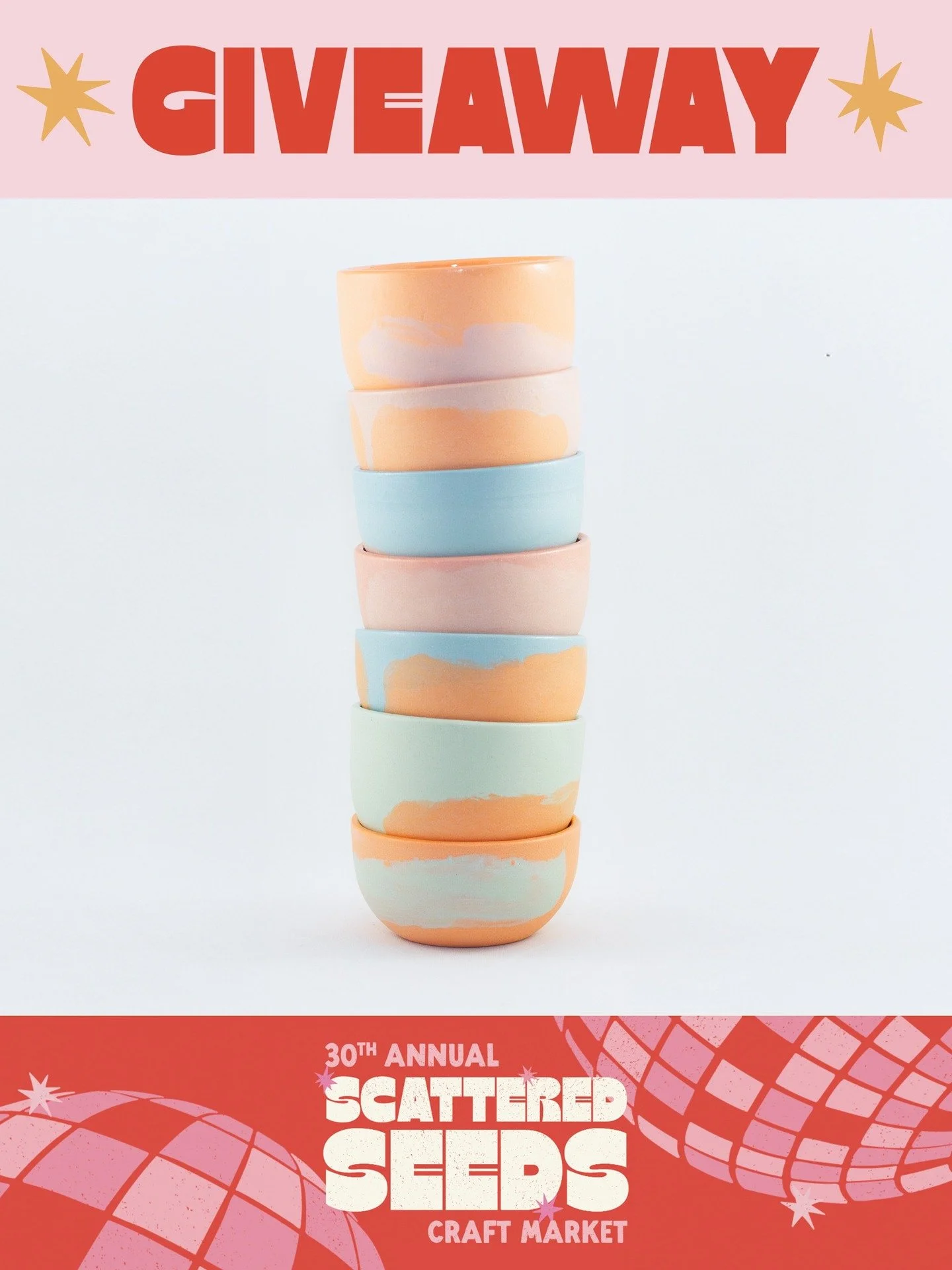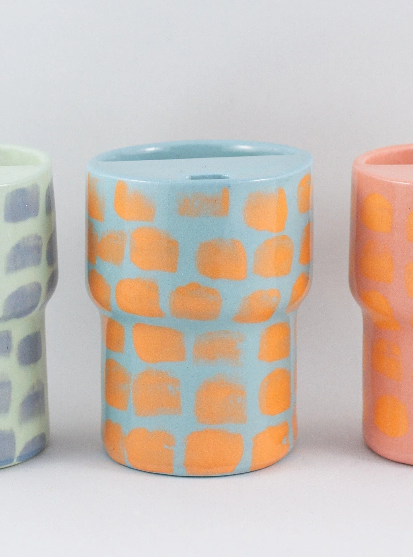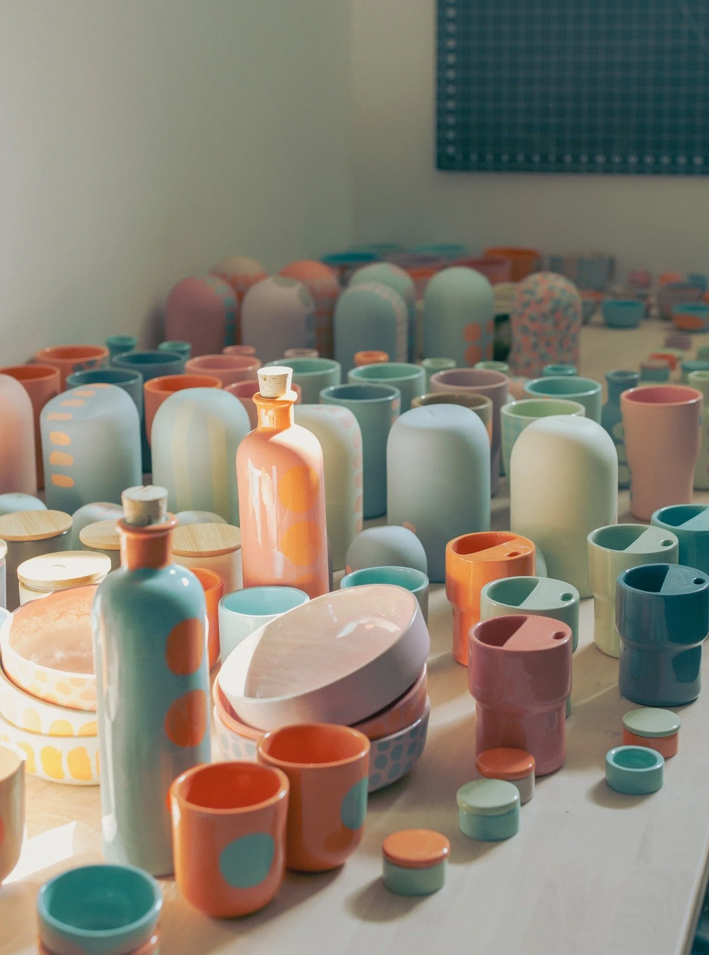 A pink jar with blue dots and a green jar with pink dots filled with pencil crayons on a table with a child's drawing and hands.