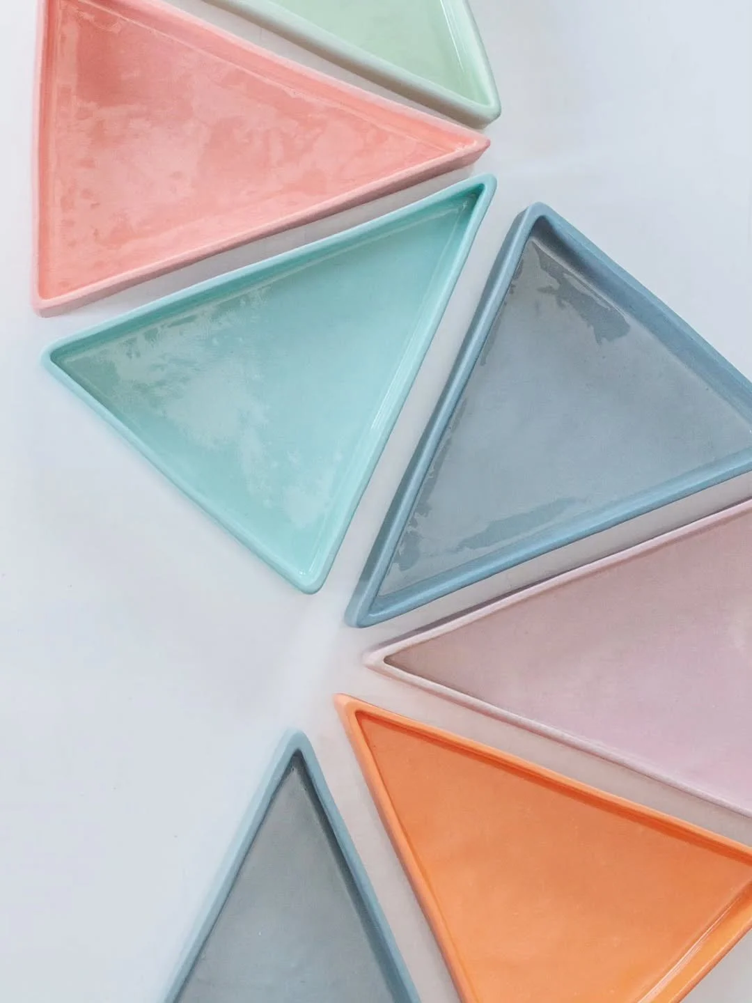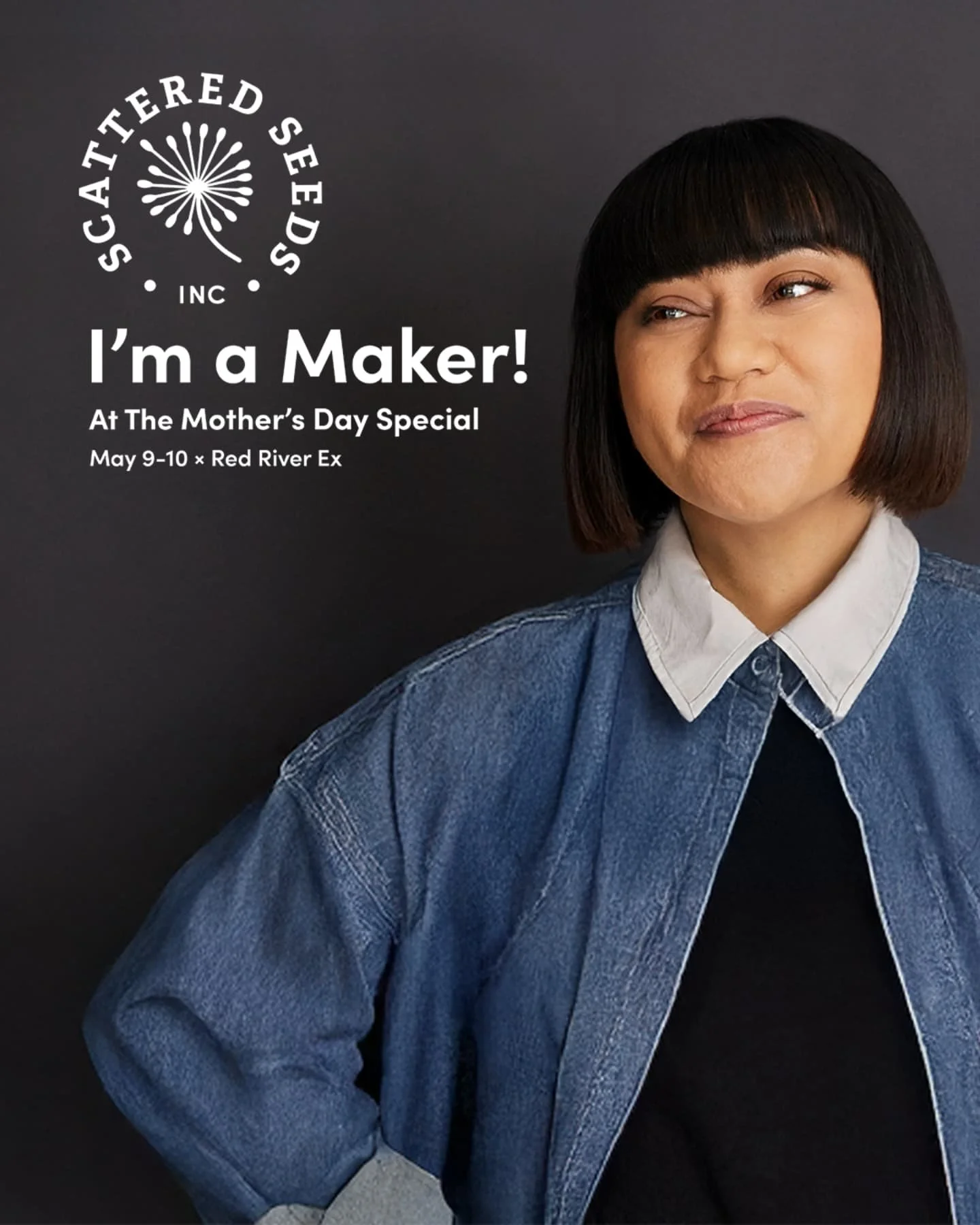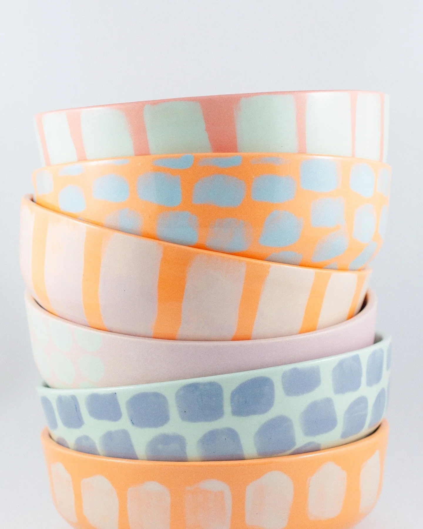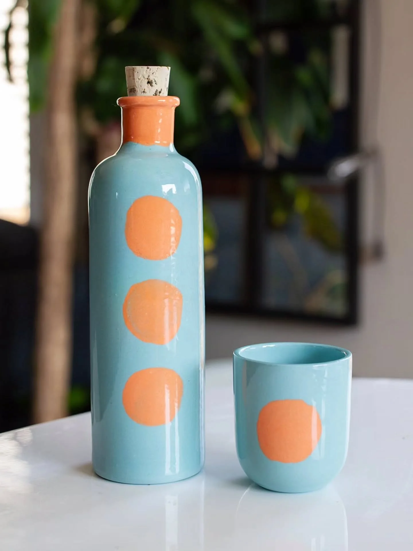 A pink jar with blue dots and a green jar with pink dots filled with pencil crayons on a table with a child's drawing and hands.